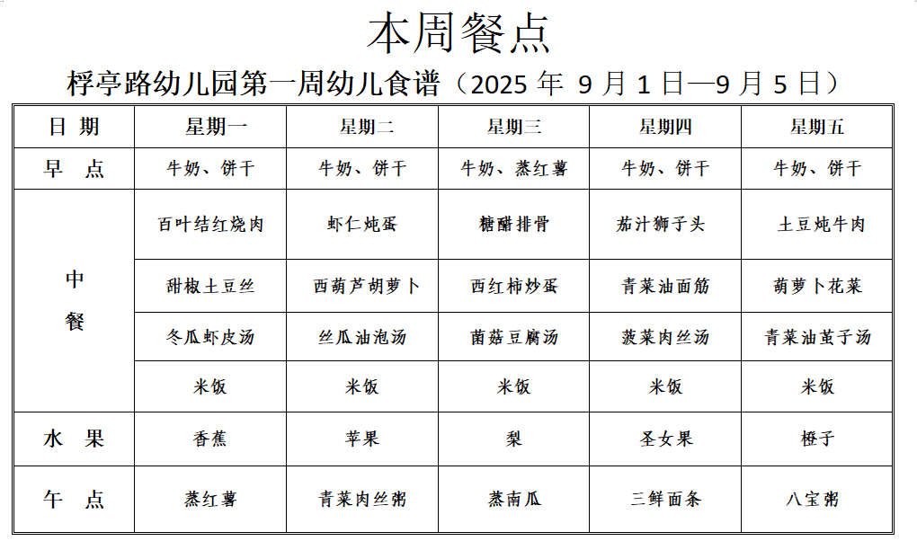 2025-2026学年第一学期第一周幼儿食谱(2025年9月1日—9月5日)