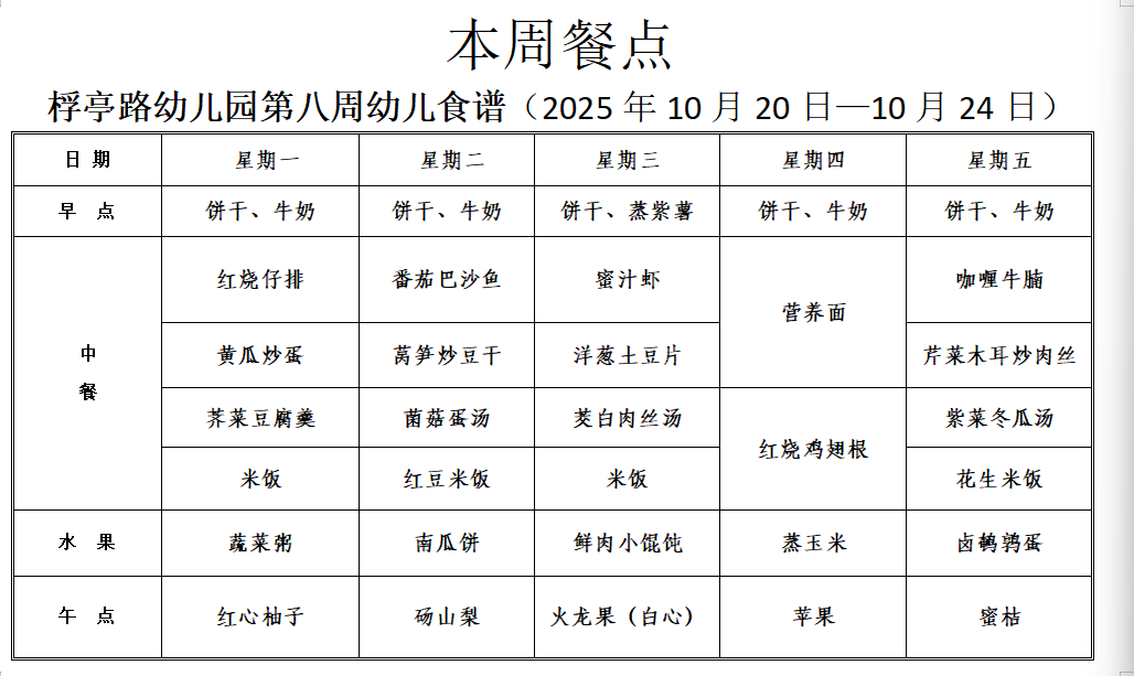 2025-2026学年第一学期第八周幼儿食谱(2025年10月20日—10月24日)