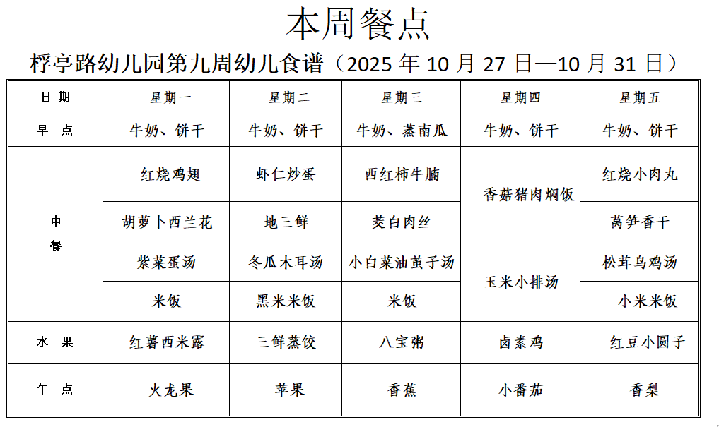 2025-2026学年第一学期第九周幼儿食谱(2025年10月27日-10月31日)