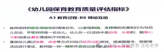 ㈠ 主持人介绍活动内容 主持人:本学期,我们将以“一对一倾听”为核心主题,开展系列研修活动。首次活动将围绕“厘清认知、破解困境”展开,帮助教师明确倾听的核心价值与实施路径。 ㈡ 交流与研讨 ⒈问题一:为什么要做一对一倾听? ⑴政策文件上的要求 最新出台的《幼儿园保育教育评估指南》中在A3教育过程B8中特意提出师幼互动,并且对于师幼互动的内容和方式具有明确的要求。
